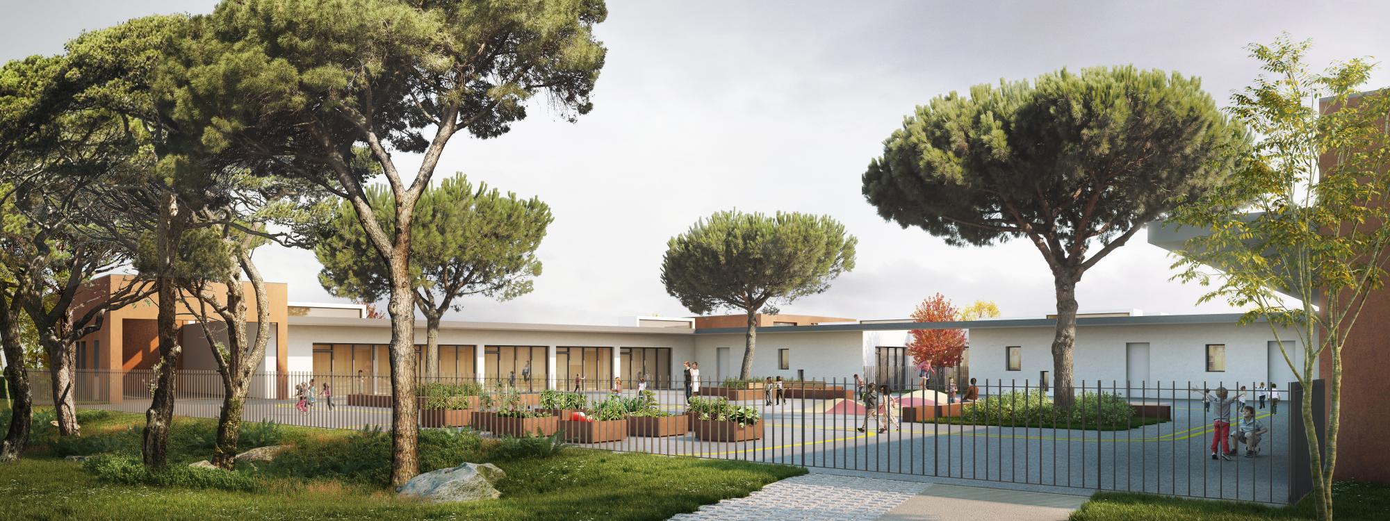 Le langage des patios, élément identificateur fort de l’école existante, est réinterprêté dans le dessin de l’extension de l’élémentaire et celui de la nouvelle école maternelle. Pour unifier l’ensemble, les façades sur rue sont enveloppées dans une double peau en terre cuite rappelant la couleur des pierres bordelaises. Cette double peau se dilate devant les baies et les patios. Les volumes clef du projet dont la salle de motricité sont étirés en hauteur et peint avec un enduit corten. A l’image du programme qui a été proposé et respecté ici, le restaurant scolaire vient entre les deux écoles, comme un lien unificateur qui clos le parvis sur le troisième côté. Les espaces intérieurs et leurs ambiances correspondent à de réelles volontés architecturales basées sur le programme, la pédagogie, le bien être de l’enfant. Côté cours, une conception paysagère a été réalisée afin de créer un véritable monde intérieur. Les patios sur lesquels s’ouvrent les classes, les pins qui ombrent les cours, et le fond de scène végétal composé autour de l’aire logistique font partie intégrante de la vie des enfants.