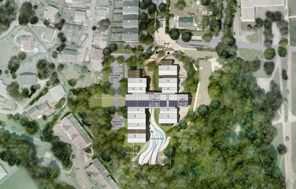 Le projet de groupe scolaire se déploie le long d’un fleuve végétal tel un hameau nouvellement implanté dans une lumineuse clairière bordant le parc du Talweg. Cette coulée verte structure le plan et amène enfants et parents depuis le parvis vers chacune des entités de l’école. Les entrées des équipements s’implantent le long de cet axe et permettent ainsi au parc de pénétrer généreusement dans le groupe scolaire. Par sa cohérence architecturale, le projet évoque le village, alternant des maisons ossature bois habillées de mélèze pré-grisonné et de zinc clair, percées selon les fonctions qu’elles abritent. Ces toitures plissées sont en relation directe avec leur environnement urbain. Le confort d’été est assuré par la possibilité de créer des courants de ventilation traversants, des brasseurs d’air, un système de rafraîchissement adiabatique et des protections solaires type brise soleil orientables.