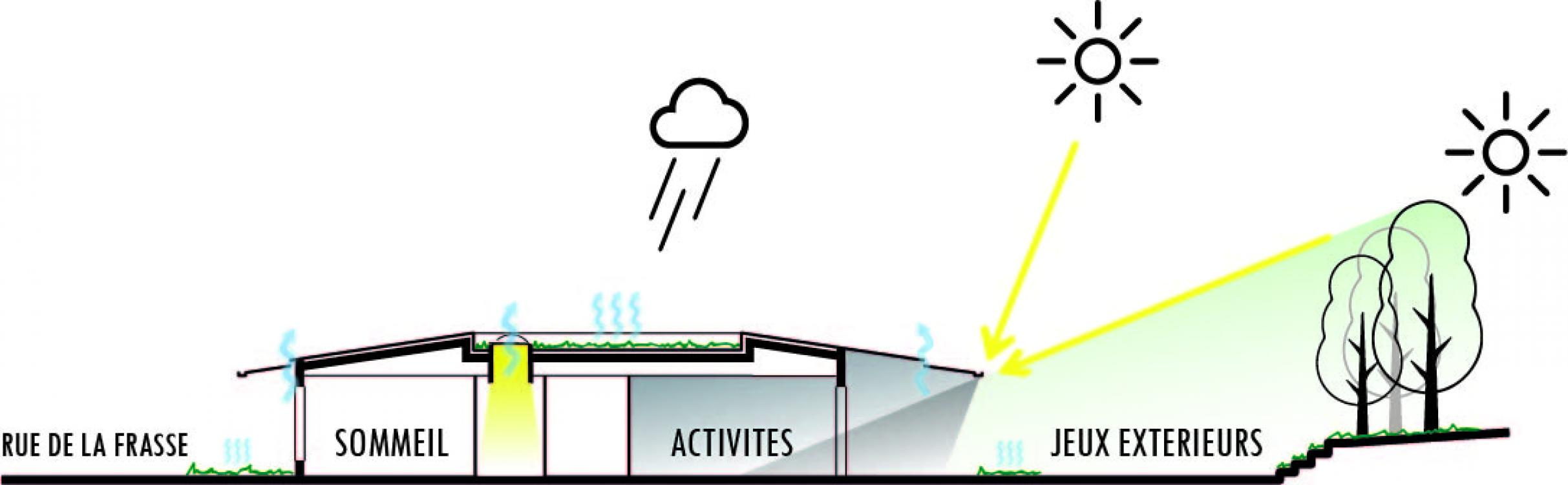 L’origine du projet s’établie d’abord sur son contexte environnemental. En effet, situé à la lisière d’un bois, l’idée d’un écrin protecteur à l’image d’une cabane en bois s’est rapidement dessinée. La volonté de protéger les enfants de toutes agressions y compris celles du climat a guidé la conception de ce projet dense et compact. Un jeu de transparences permet d’irriguer les différents espaces de lumière, tout en restant abrité grâce à une large avancée de toiture, percée de verrières colorées apportant fraîcheur et lumière. Cette toiture, développée dans un volume résolument simple, sculpte une cour ovale dont la dynamique est soulignée par l’aménagement végétal et arboré, renforçant le caractère intimiste de ce jardin extérieur.