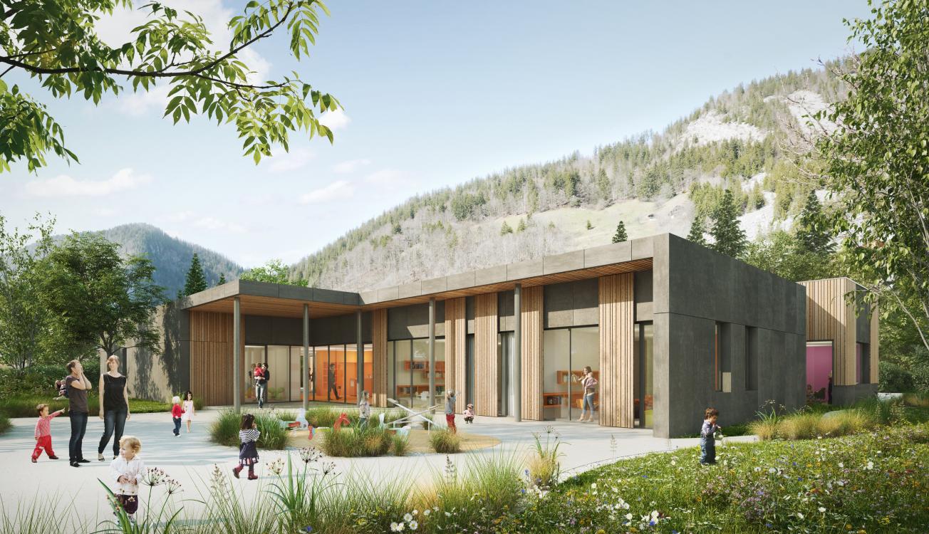 Interface entre la zone urbaine du centre-ville et la montagne, ce projet à l’architecture délicate se veut être l’objet d’une transition douce et maîtrisée du regard. En réponse au bâtiment imposant qui l’avoisine, le Pôle Petite Enfance s’oriente vers une simplicité architecturale résolue ouvrant au maximum sur la nature, tout en prenant en compte l’orientation et la programmation du projet. Ce-dernier répond à une volonté de centralité du programme autour d’un cœur ouvert matérialisé par le hall d’accueil et la salle de motricité. En effet, situé en bordure de village et en hauteur par rapport au chef-lieu, ses espaces traités en open space bénéficient d’une vue largement dégagée sur les montagnes environnantes, permettant une liaison visuelle agréable entre intérieur et extérieur.