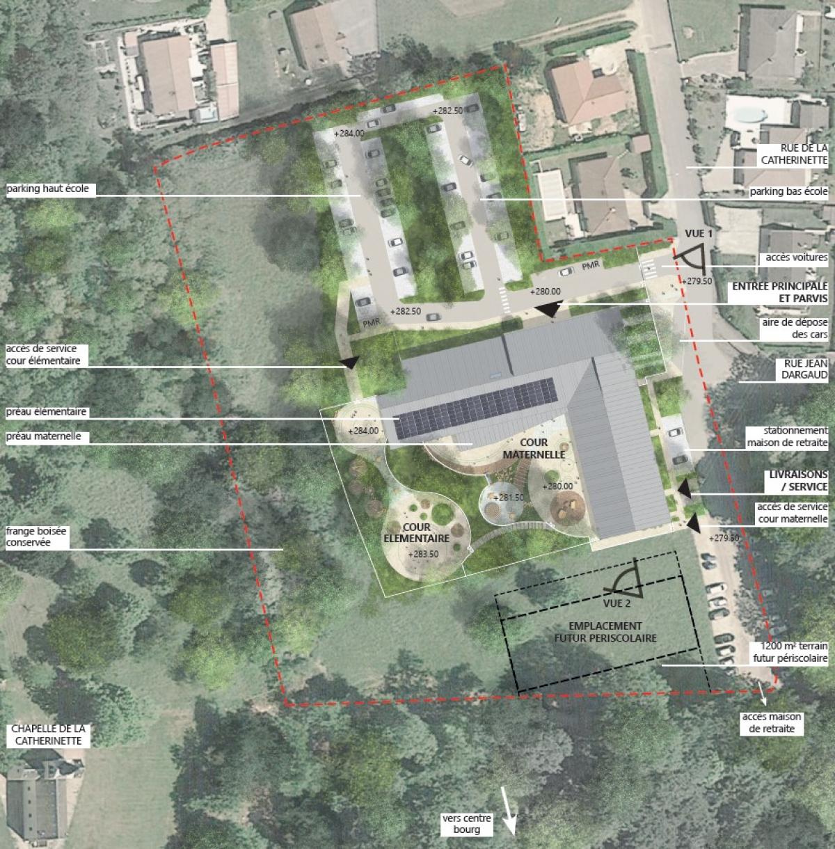 Situé dans un quartier pavillonnaire, le terrain du projet jouit d’un emplacement privilégié au cœur d’un environnement bucolique fortement boisé et à proximité d’une chapelle. Le site présentant une forte déclivité, la recherche de frugalité est au cœur du projet, que ce soit par le choix de l’implantation, au plus proche du terrain naturel, par la volumétrie compacte en R+1 qui limite l’emprise au sol du bâti, et également par les principes constructifs. L’utilisation d’une structure mixte bois-béton, permet ainsi de limiter l’impact carbone tout en assurant l'inertie du bâti.